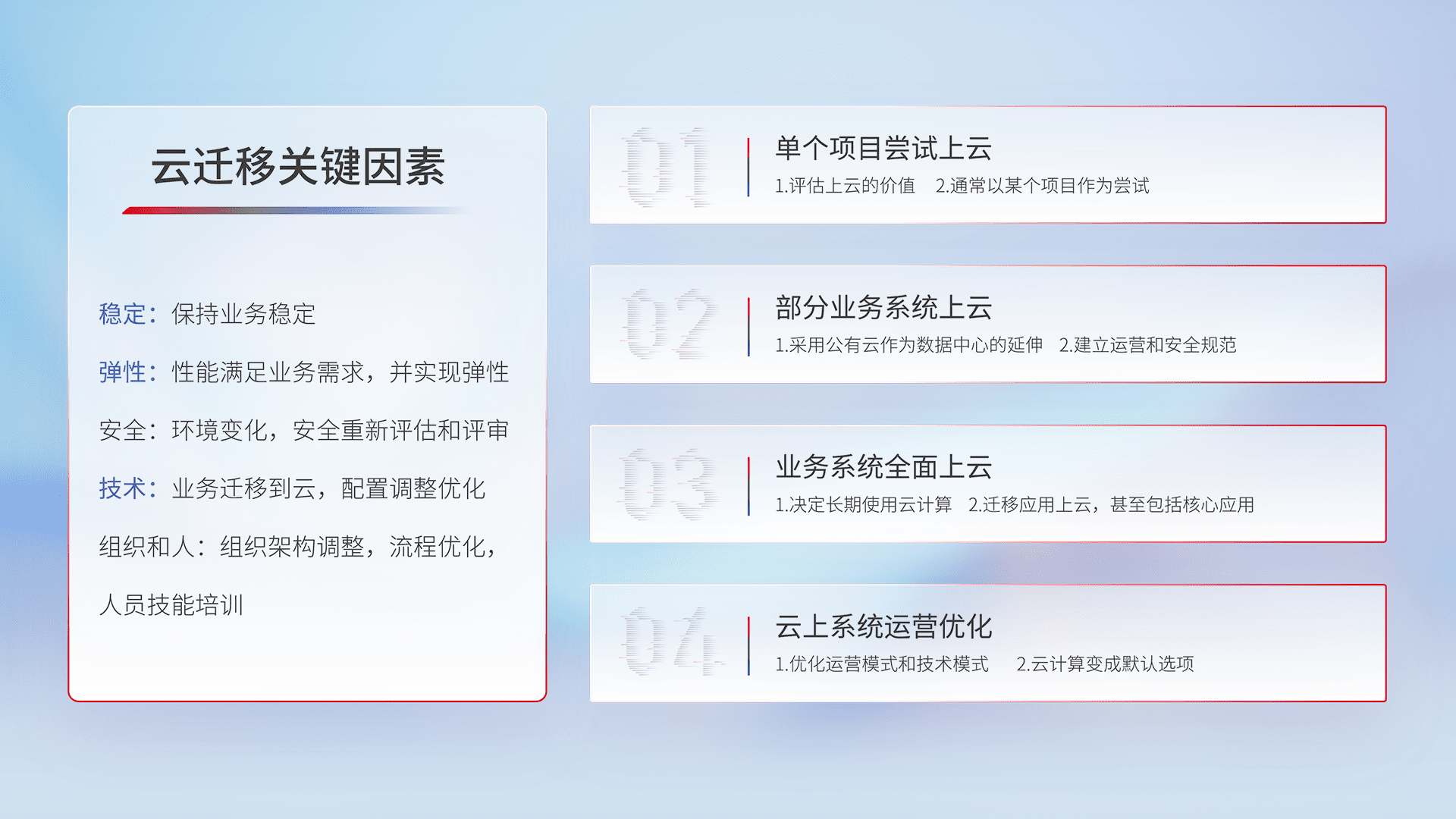 结合实际业务,,,,从规划设计、、云平台选型、、云原生改造、、数据迁移、、、、集成交付,,,,迁移全过程为客户识别最佳上云路径,,做好风险识别管理,,设计网络架构、、、身份权限、、、安全审计合规、、操作审计、、、日志审计、、、、监控告警策略、、多站点容灾设计等,,,对云上基础设施进行整体规划,,提升IT治理水平,,以满足弹性、、、高可用、、高性能的需求。。。