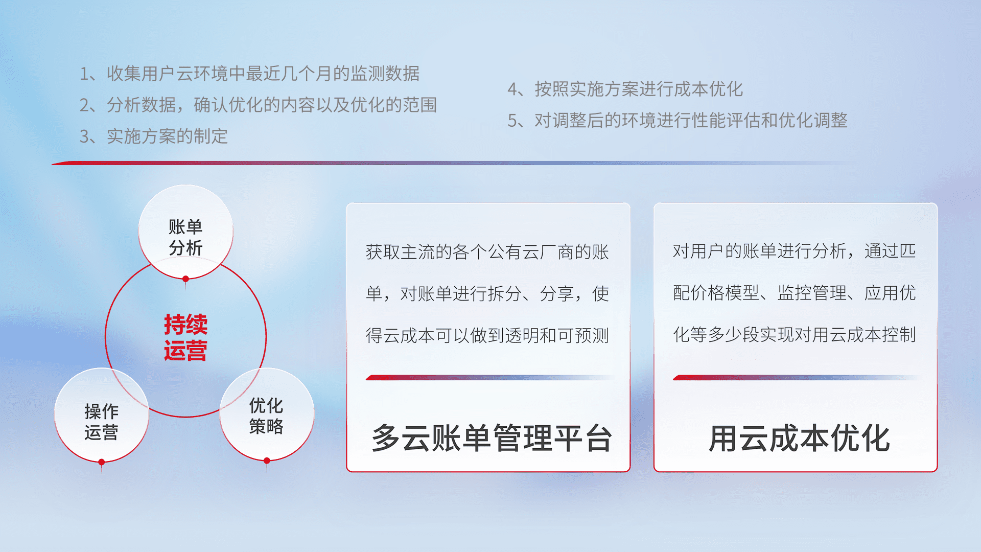 通过多云纳管,,,,以统一的资源数据模型把客户的云资源进行抽象和封装,,,进而实现对多云资源的统一操作,,保障云资源管理的可靠性、、稳定性与可用性。。。量身定制化运维内容,,配置、、开发运维、、、补丁管理、、、备份、、、监控、、认证和访问管理、、、审计和日常巡检等,,,保障在用云过程中的可靠度,,,,稳定度以及高可用率。。。