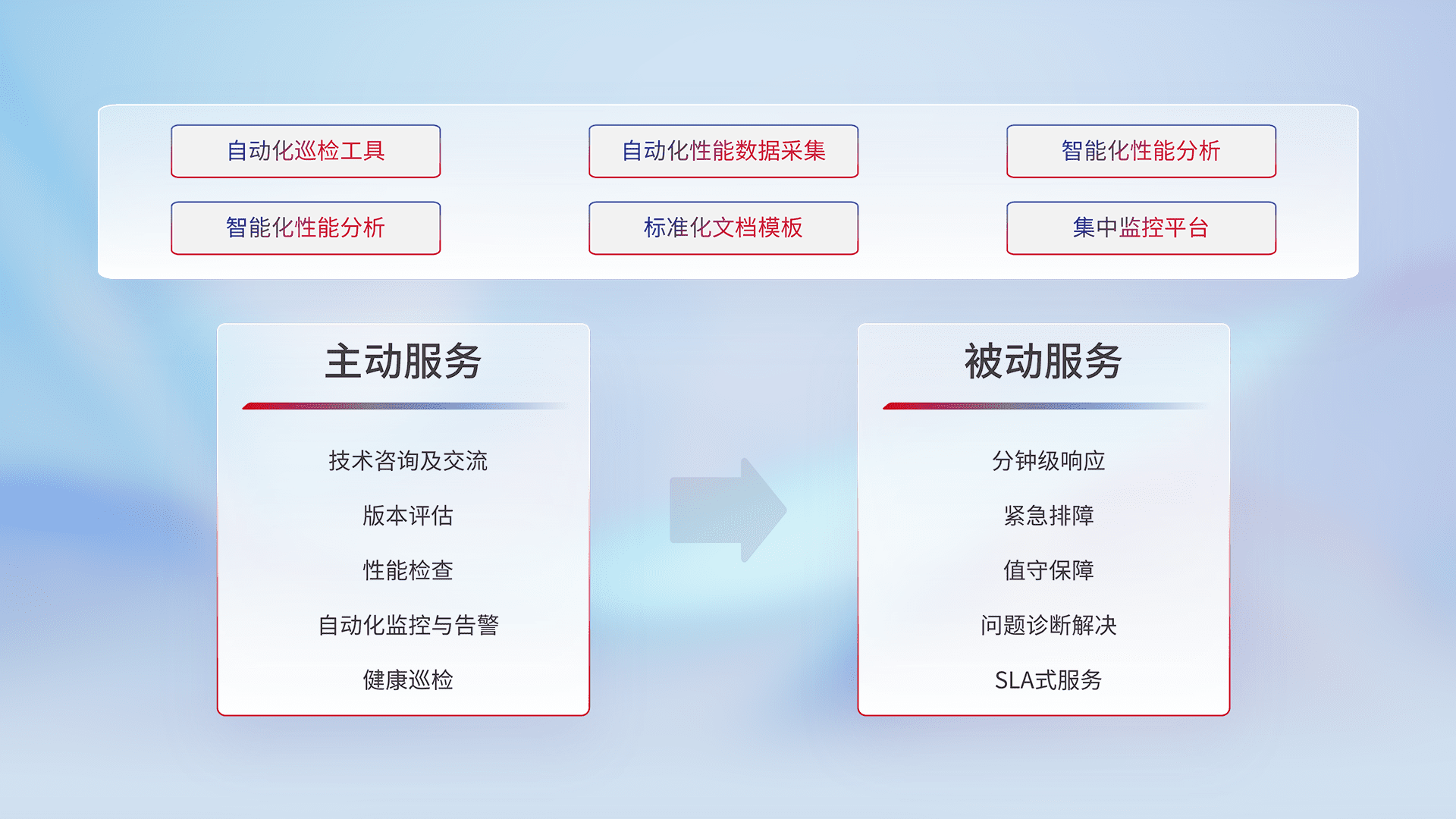 智能化工具和标准化文档,,保障服务质量,,,,提供主动服务(包含技术咨询、、版本评估、、、性能检查、、、自动化监控与告警、、、健康巡检)和被动服务包含(分钟级响应、、、紧急排障、、值守保障、、、问题诊断解决、、、SLA服务)。。。。