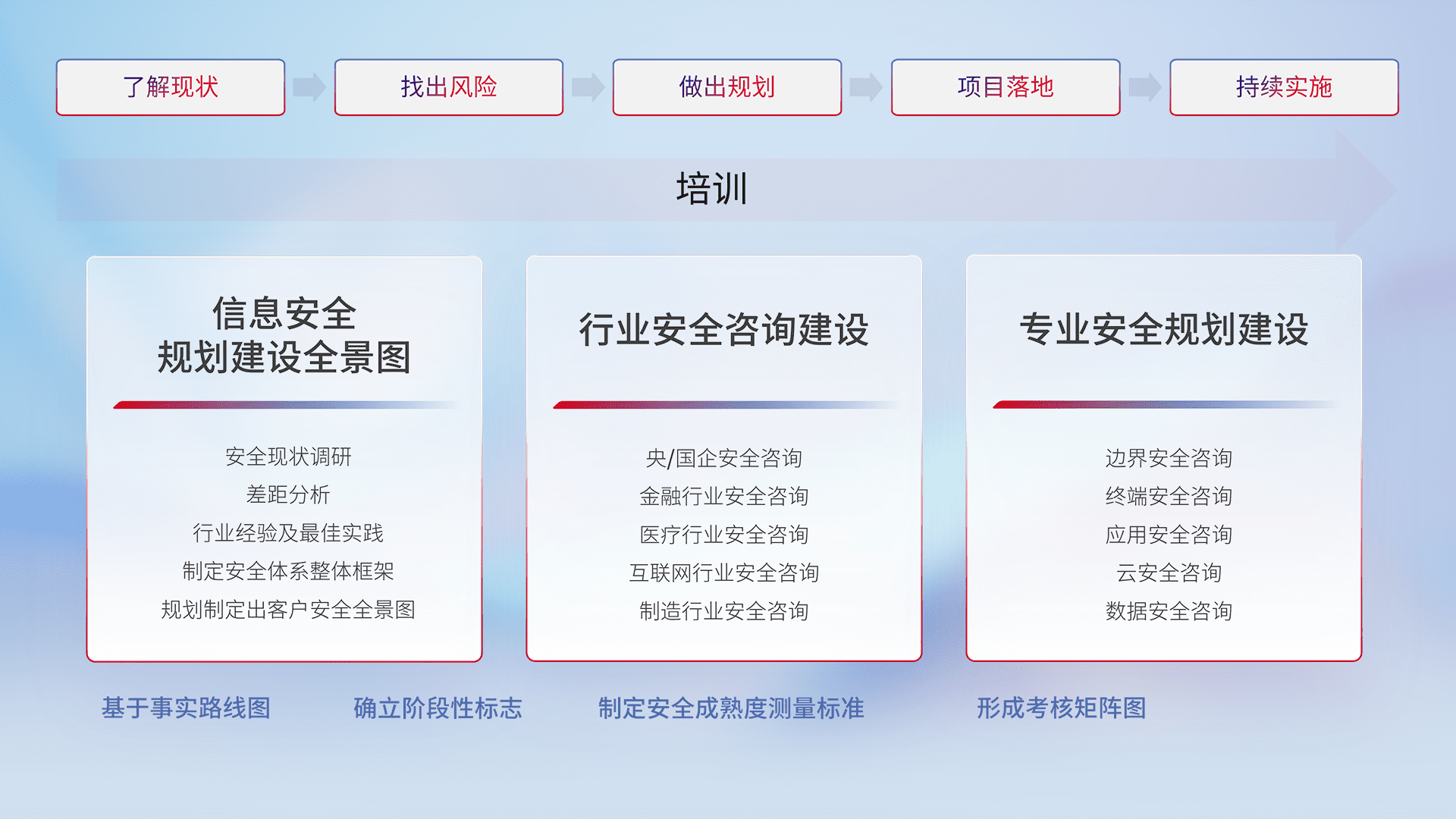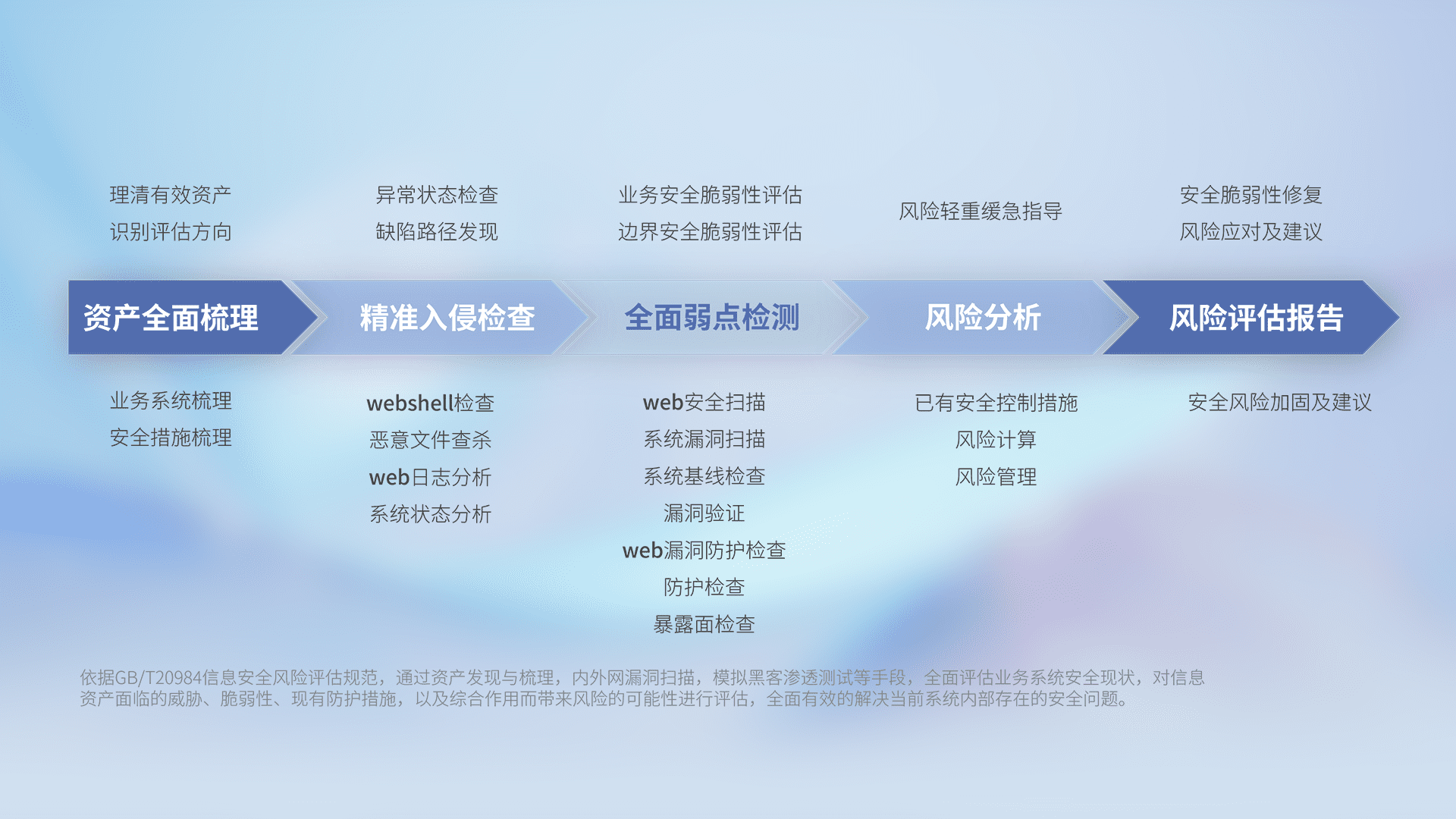 针对客户行业特性,,,,以专业的安全服务+多厂商联合解决方案提供专属的一站式安全管理服务,,帮助客户全面感知网络空间威胁,,,,基于识别、、检测、、、、分析、、、、防护、、、监测、、、响应的服务理论模型,,,从方案咨询、、集成交付、、评估验证、、、优化加固、、、运维运营,,致力于为客户提供完整的闭环管理式安全服务。。。以实战经验为客户打造高抵御风险的安全体系,,,帮助客户发现威胁、、、、对抗威胁、、、处置威胁,,,不断积累安全对抗能力,,持续保障数字化安全。。。